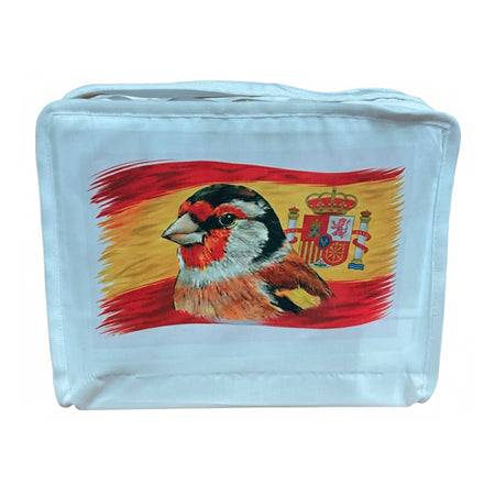Funda para jaula C2 con diseño exclusivo de jilguero sobre bandera de España. Fabricada en tejido resistente, con cremallera y asa superior para transporte cómodo. Protege del frío, la luz y el viento, creando un entorno más tranquilo para tu ave en casa o en concursos.