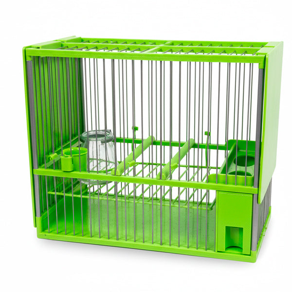 Jaula C2 fabricada en acero inoxidable con acabado verde lima. Ideal para jilgueros y otros silvestres. Incluye todos los accesorios necesarios para cría, transporte o concursos. Su diseño colorido y resistente la convierte en una opción práctica y duradera para el cuidado de tus aves.