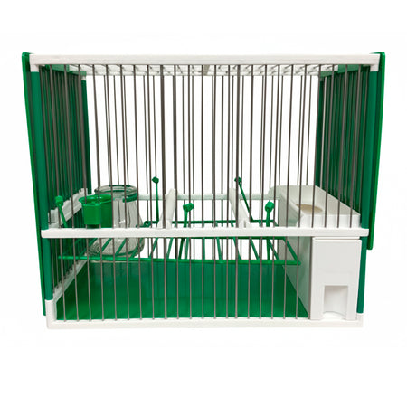 Jaula C2 blanca y verde fabricada en acero inoxidable, resistente, práctica y totalmente equipada para jilgueros y aves silvestres. Perfecta para concursos, transporte y uso diario, con limpieza rápida y accesorios incluidos.
