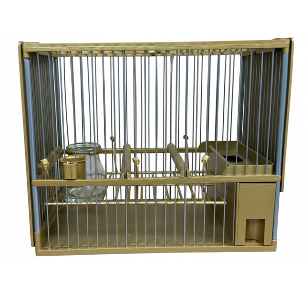 Jaula C2 dorada fabricada en acero inoxidable, elegante, resistente y totalmente equipada para jilgueros y aves silvestres. Ideal para concursos, transporte y uso diario, con limpieza rápida y accesorios incluidos.