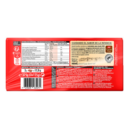 - Textura cremosa y suave: El chocolate con leche Nestlé Extrafino es famoso por su textura que se derrite en la boca y su equilibrado sabor dulce.